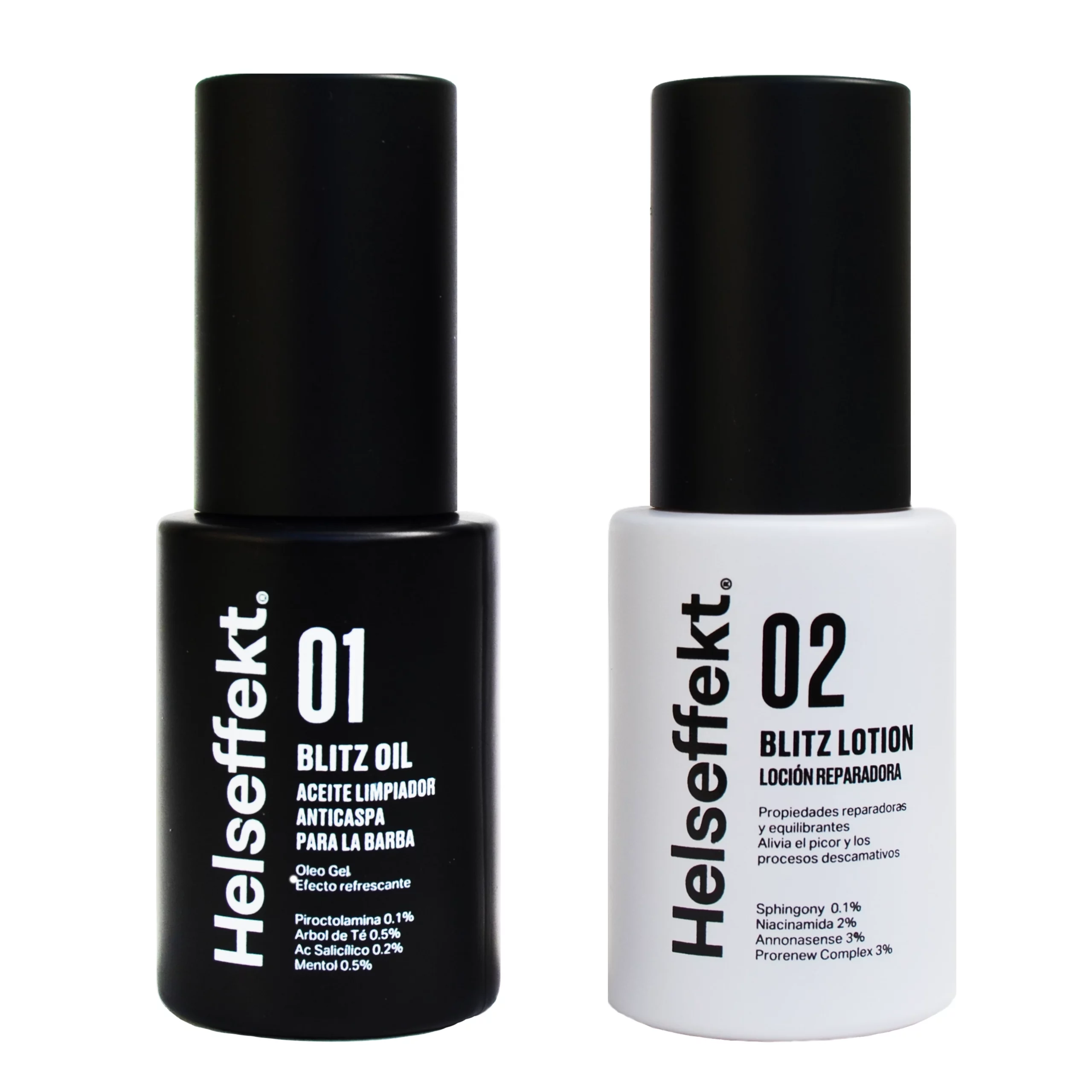 El revolucionario tratamiento BLITZ anticaspa para la barba de Helseffekt es un tratamiento integral creado en dos pasos para que disfrutes de una barba sin caspa y una piel más sana desde la primera aplicación.